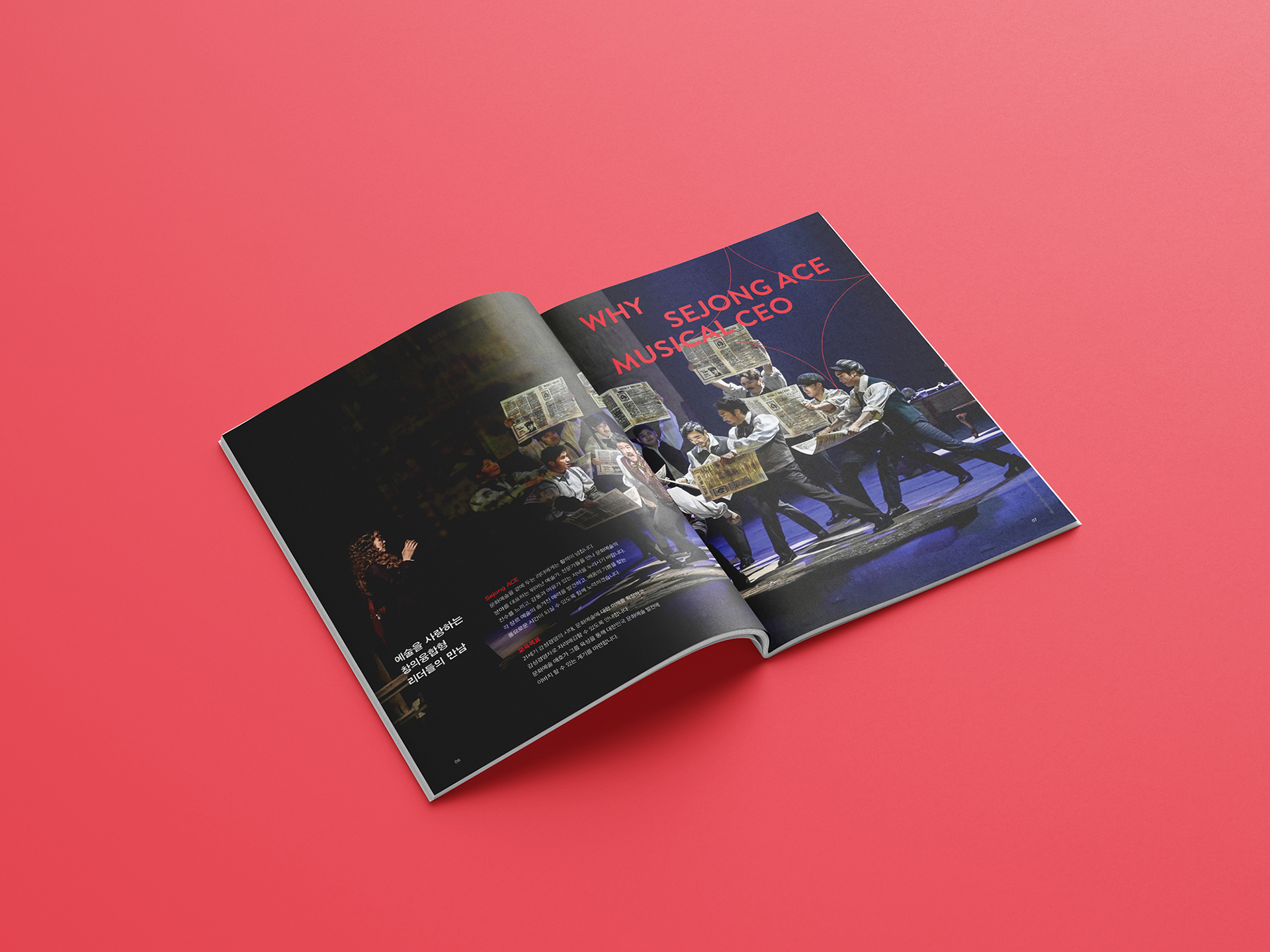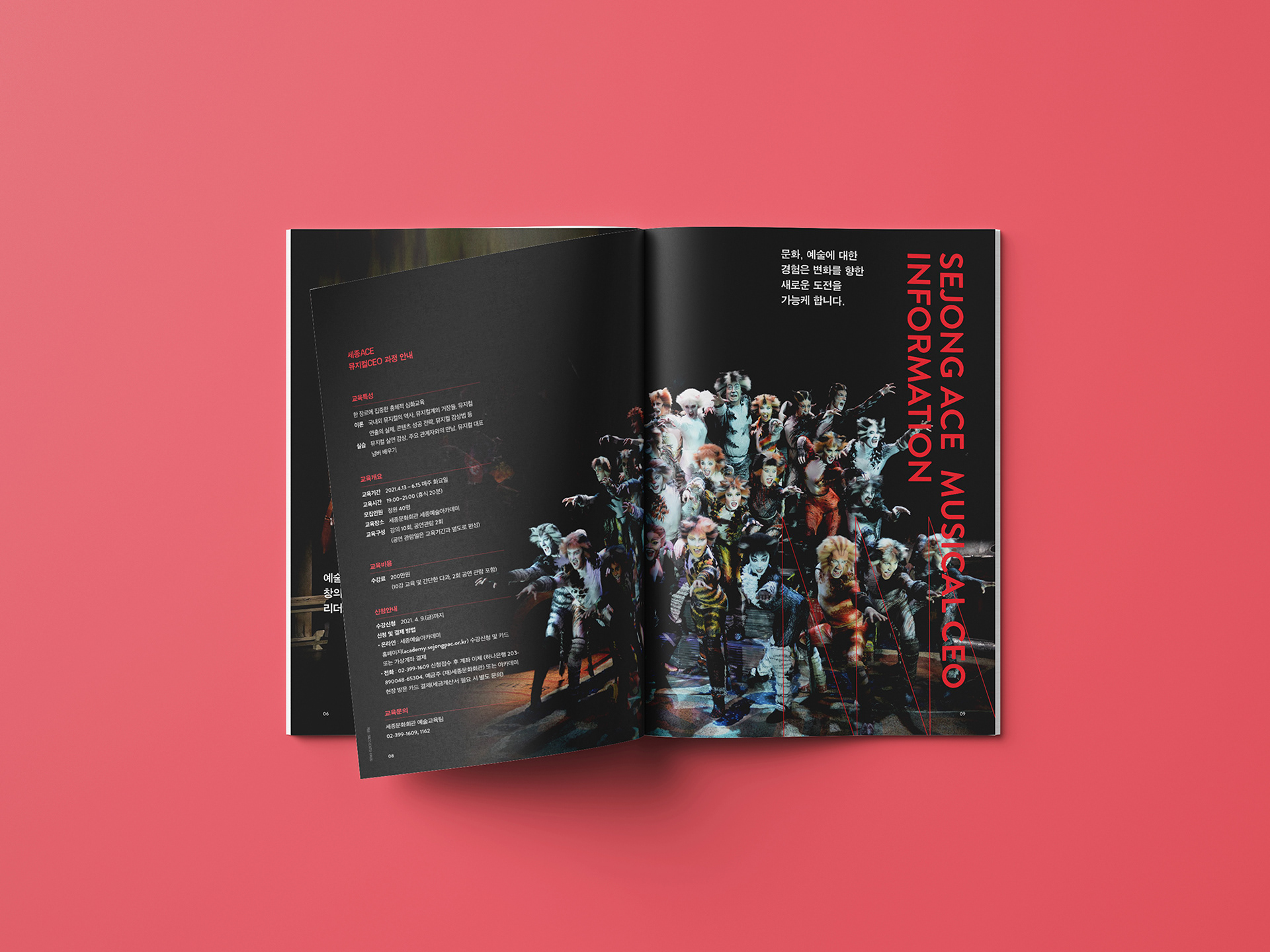세종문화회관 ‘세종ACE 과정’은 리더에게 필요한 문화예술에 대한 이해를 바탕으로 조직과 사회를 이끄는 지혜와 영감을 얻도록 구성한 프로그램입니다. ‘MUSICAL CEO’는 뮤지컬 대표 프로듀서들이 강사로 나서 뮤지컬 제작과정과 제작 비하인드 소개, 뮤지컬 노래와 연기 배우기 등을 강의합니다. ‘MUSICAL CEO’ 브로슈어는 뮤지컬 무대의 상징적 오브제를 그래픽으로 표현합니다.