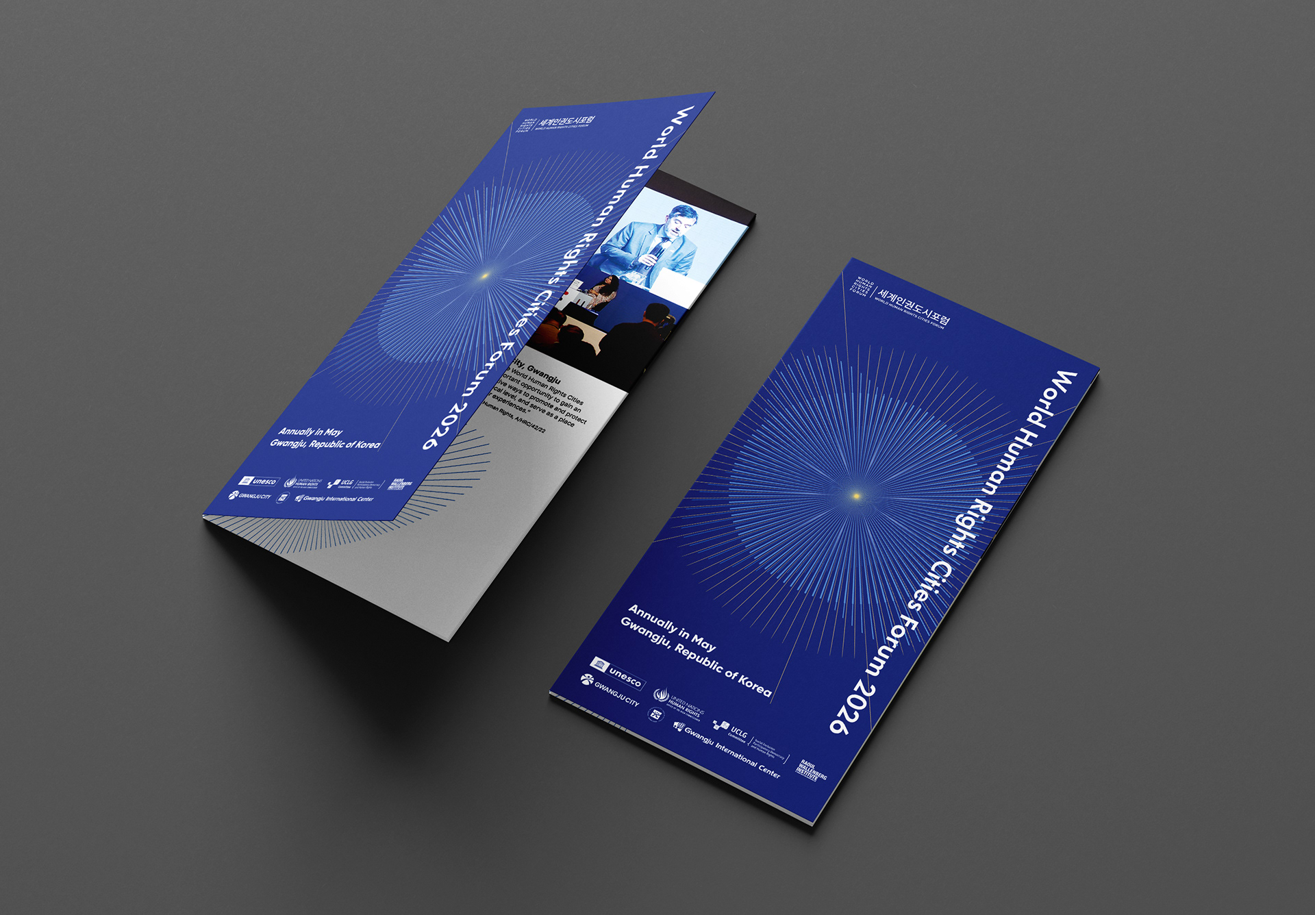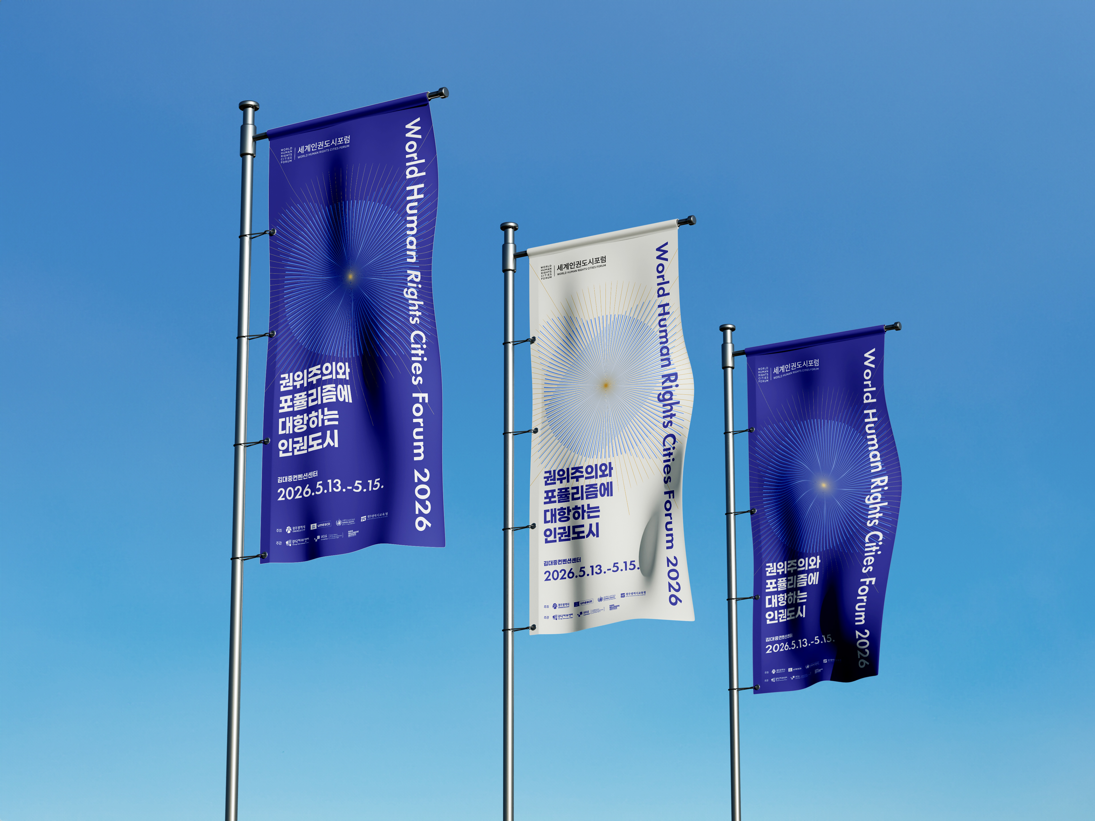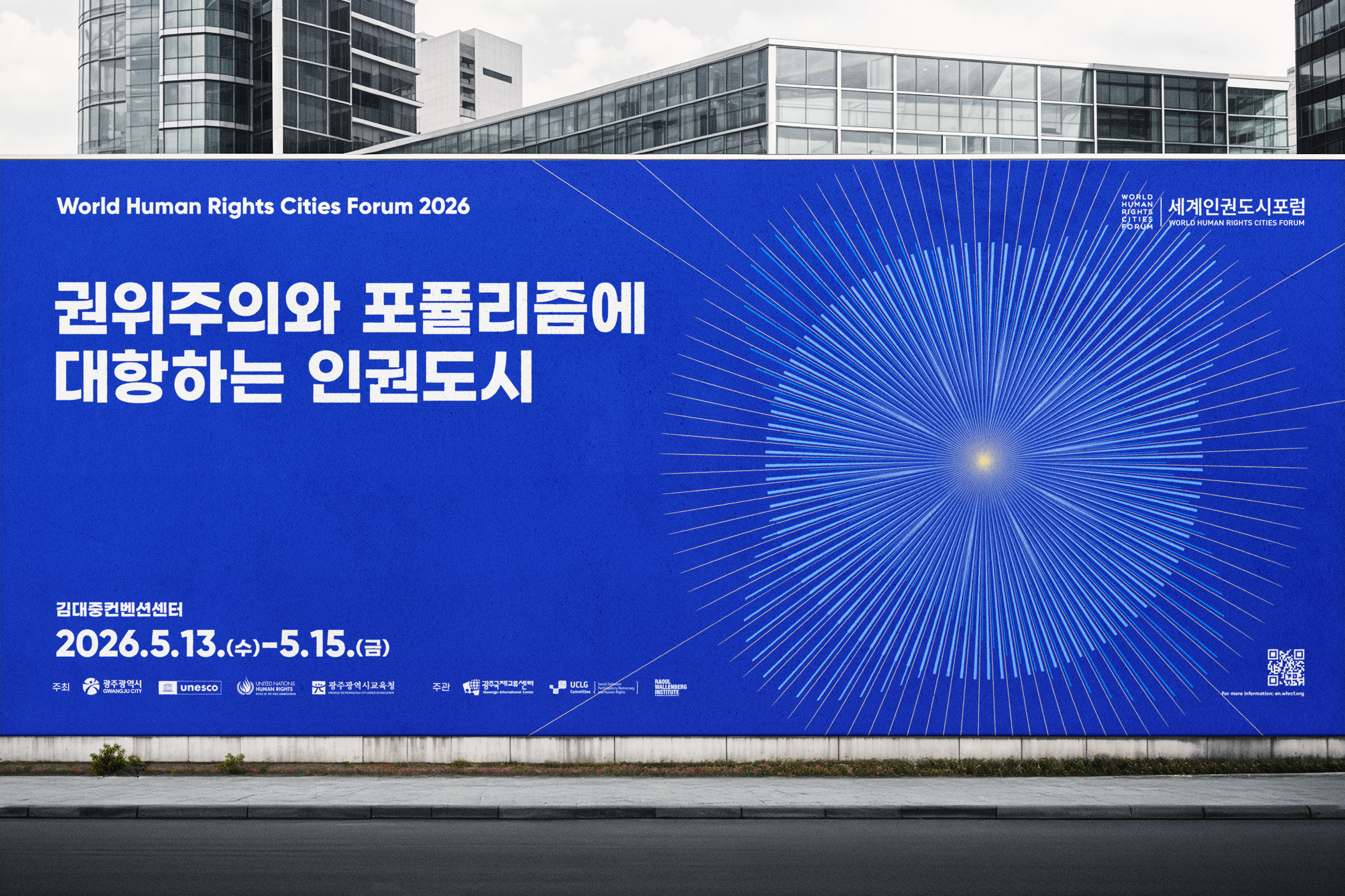 세계인권도시포럼은 2011년부터 매년 광주에서 열리는 국제 포럼으로, 인권도시의 비전을 공유하고 도시 간 협력을 확장해온 대표적인 인권 교류의 장입니다. 디자인퍼플은 한 점의 빛이 퍼져 나가며 연결되는 형상을 통해 ‘연대·저항·연결’의 의미를 시각화하여 하나의 브랜드 경험이 전달되도록 설계했습니다.