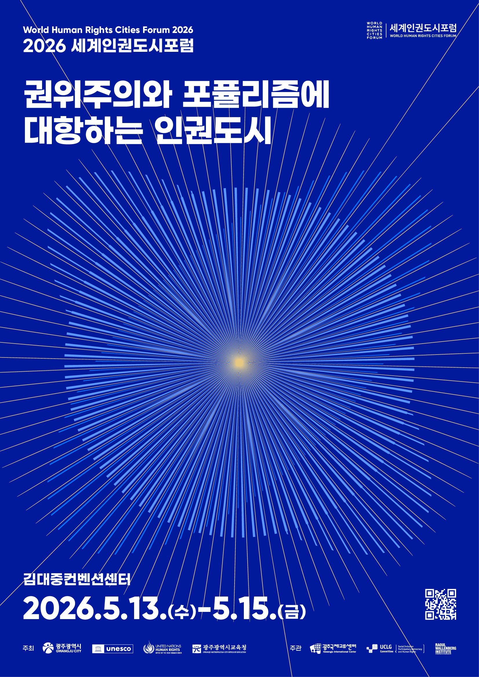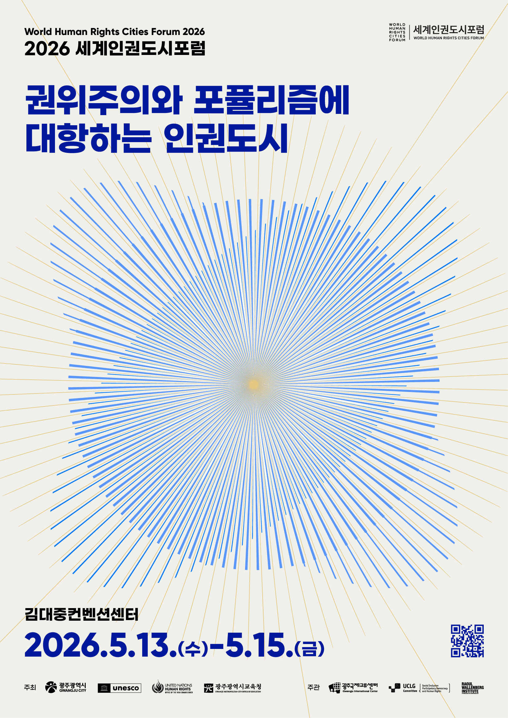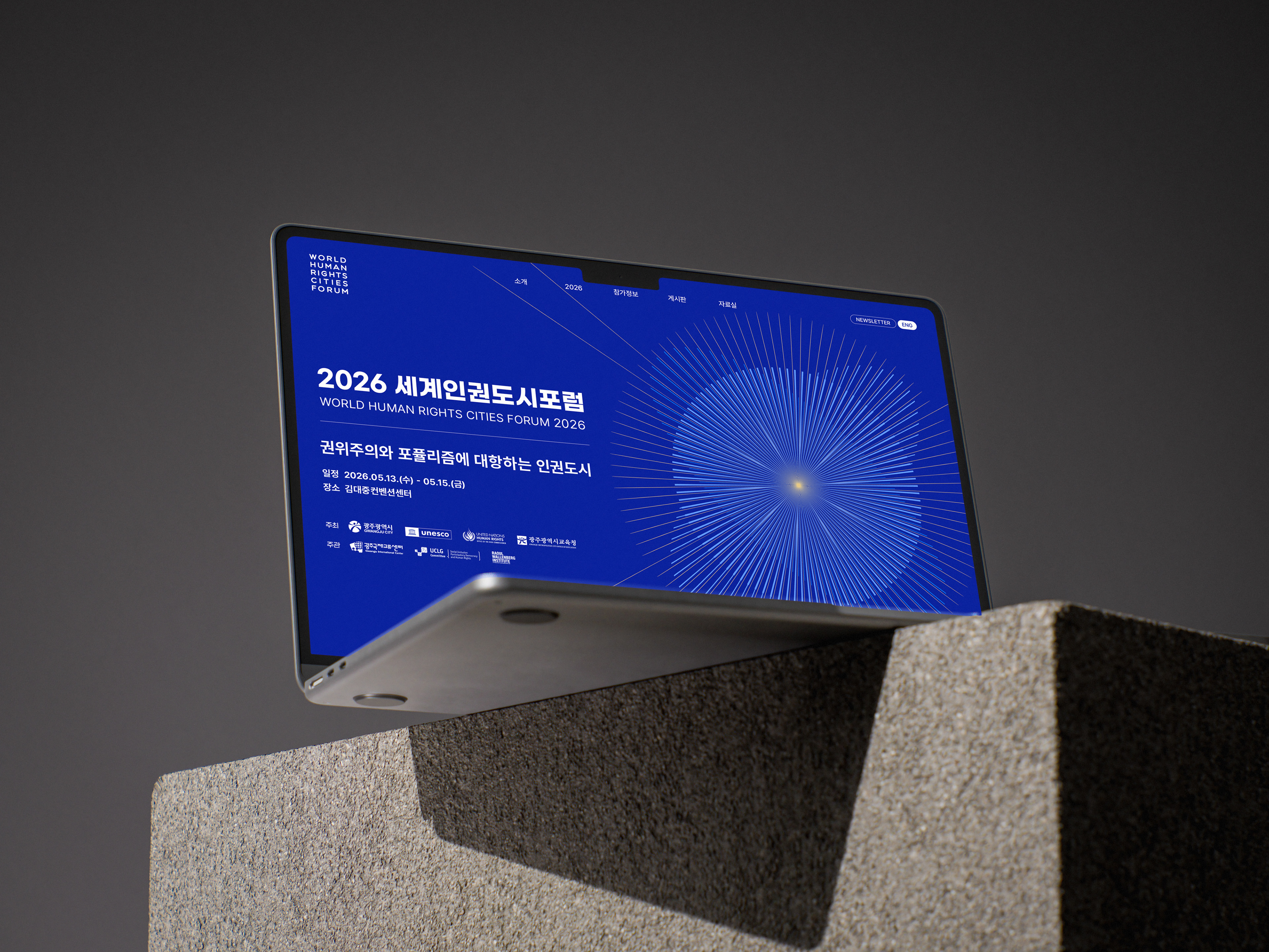 세계인권도시포럼은 2011년부터 매년 광주에서 열리는 국제 포럼으로, 인권도시의 비전을 공유하고 도시 간 협력을 확장해온 대표적인 인권 교류의 장입니다. 디자인퍼플은 한 점의 빛이 퍼져 나가며 연결되는 형상을 통해 ‘연대·저항·연결’의 의미를 시각화하여 하나의 브랜드 경험이 전달되도록 설계했습니다.