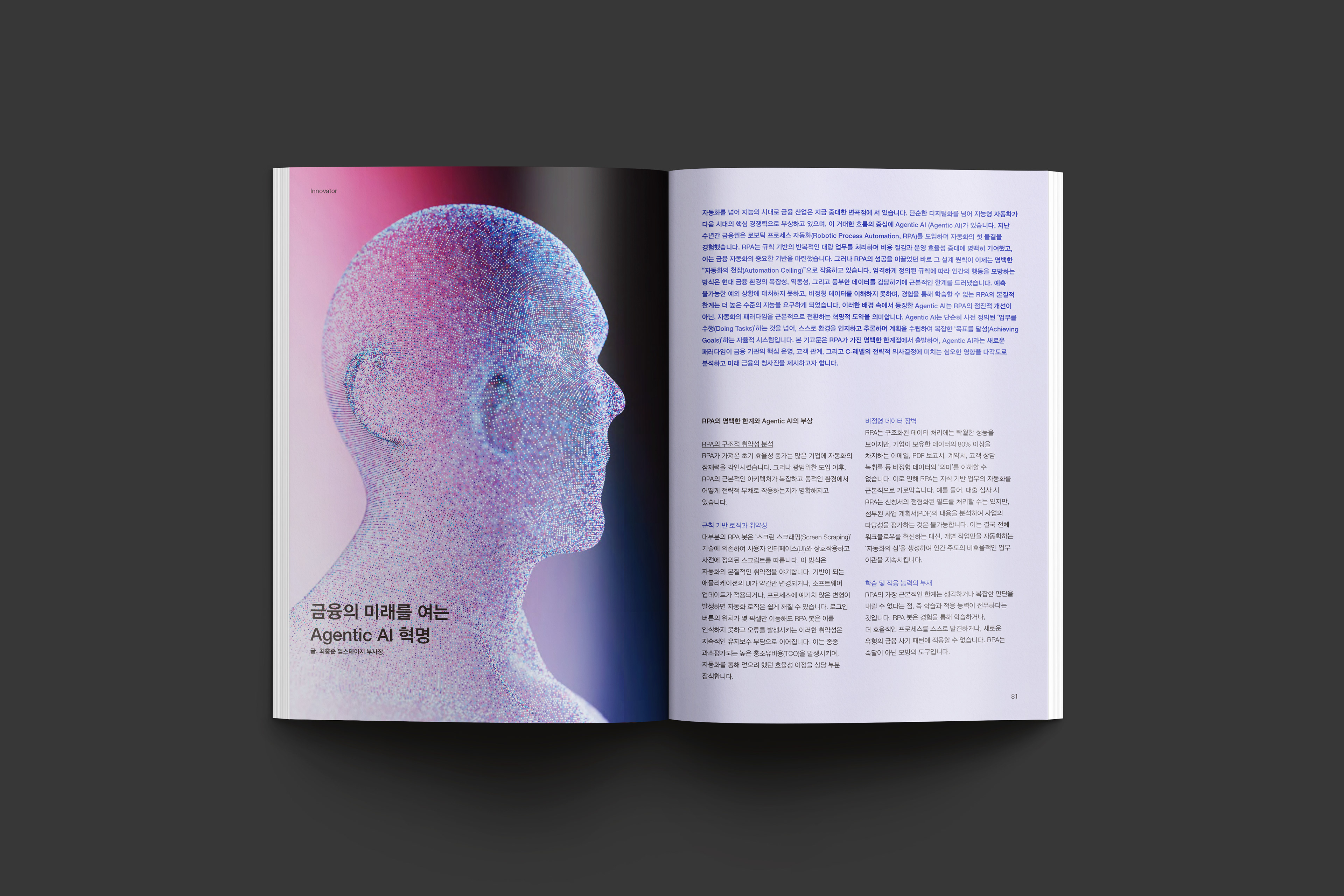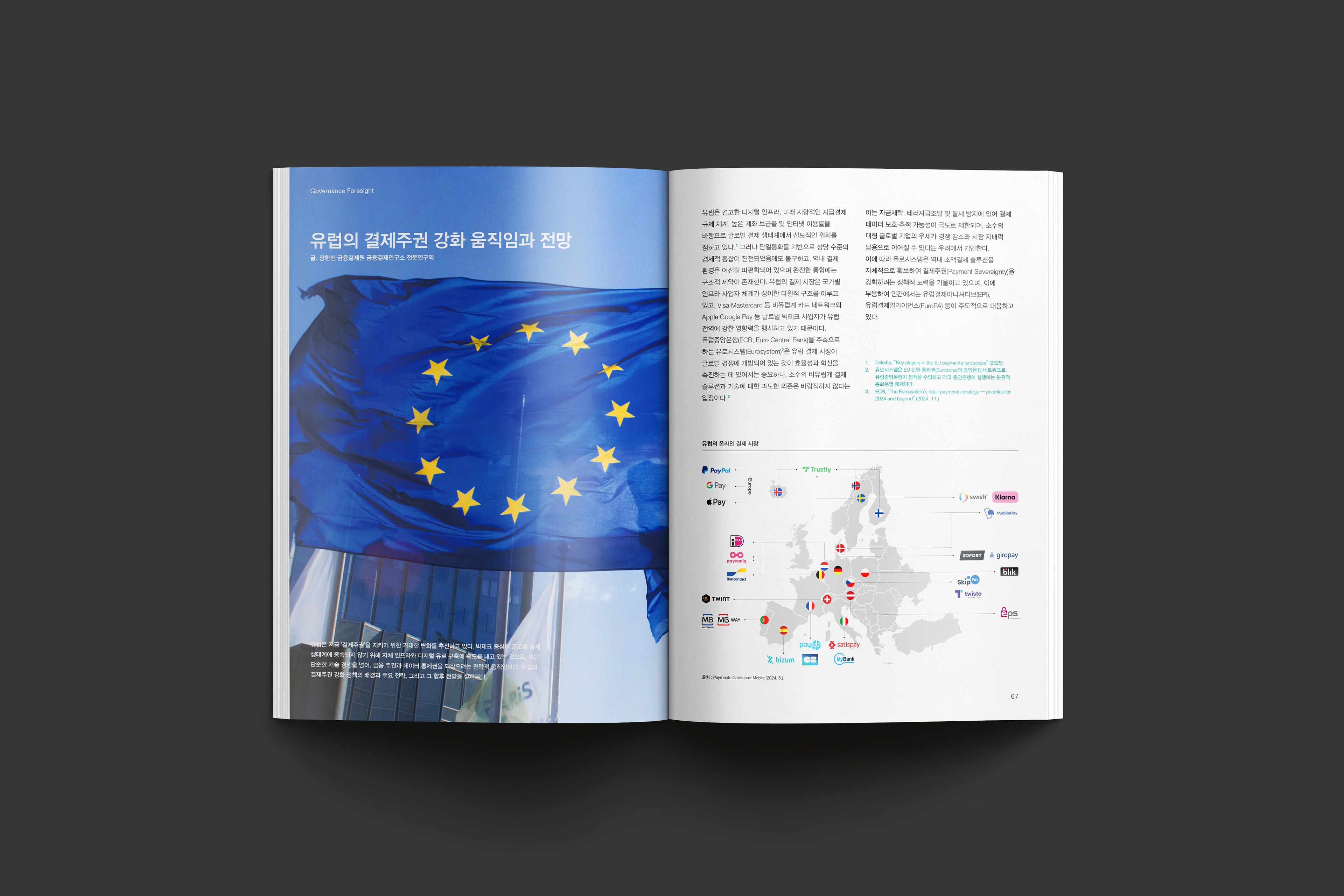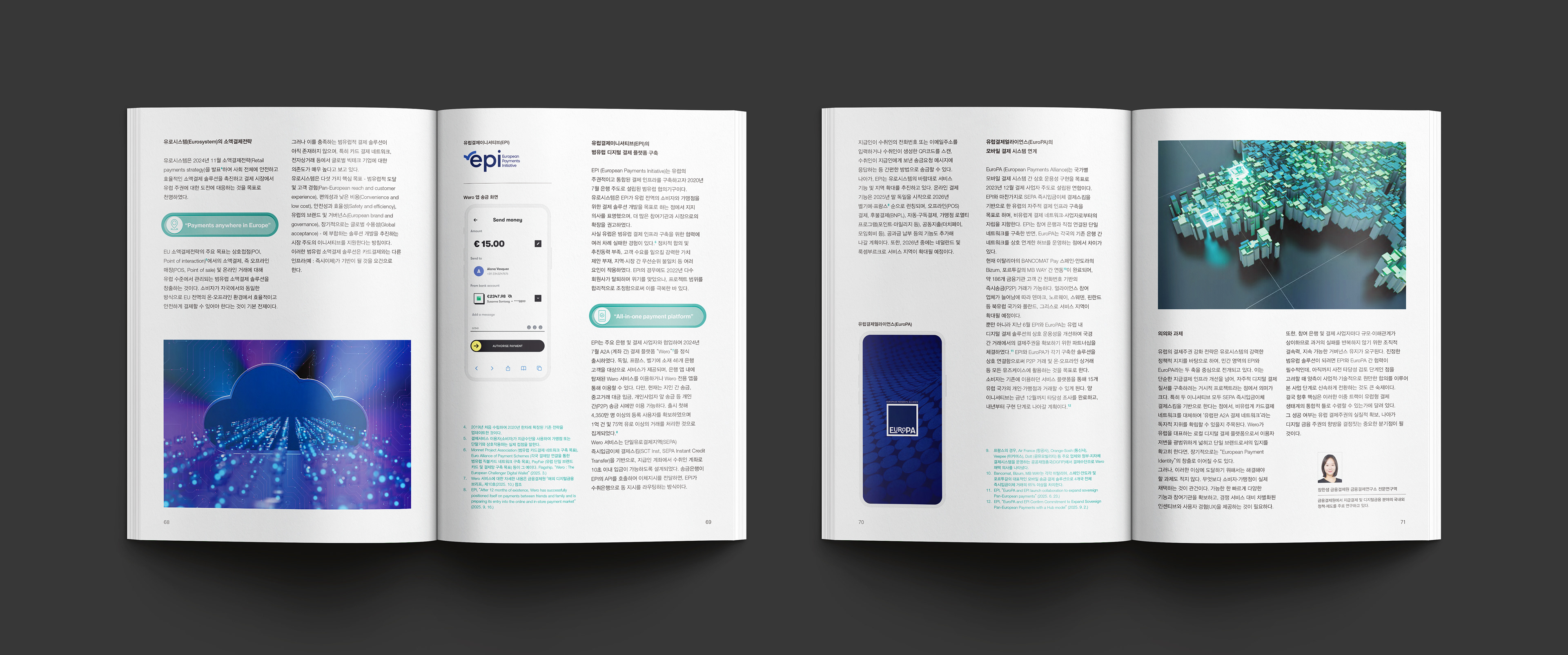 금융결제원 금융결제연구소에서 발행하는 ‘Payment Insight’는 지급결제에 관한 전문정보를 소개하는 전문 매거진입니다. 지급결제 트렌드에 대한 심층기획과 인사이트를 다루며, 매호 주제를 반영한 키비주얼 표지와 다양한 시각적 이미지 구성으로 지급결제 정보를 보다 알기 쉽게 소개합니다.